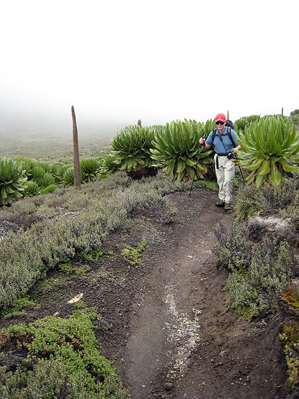 And two more: the Giant Lobelia Andy is passing among, and the tall and slender Ostrich Lobelia off the trail. |