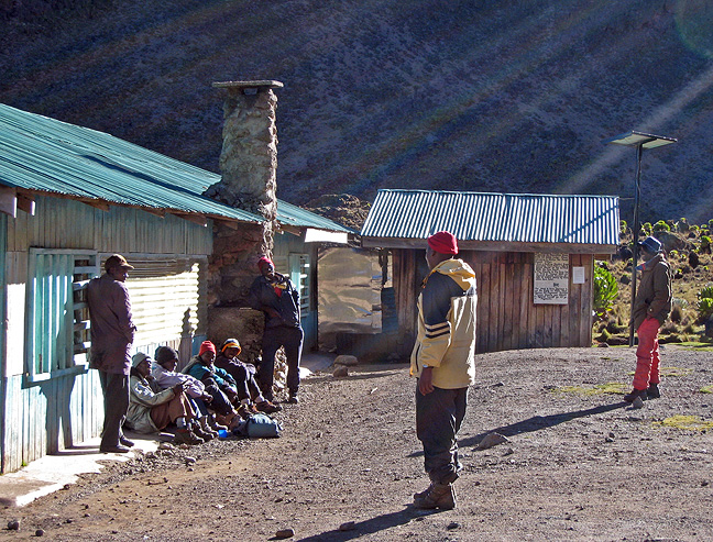 Porters for several groups soak up some early morning sunshine and friendly banter outside the Shipton hut (4200m) before heading off to their various destinations for the day. |