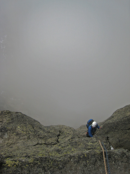 Shortly after, the predictable late-morning clouds came it as we negotiated some more strenuous climbing above. However, for the first time since our arrival, these clouds remained thin and non-threatening. We had not a drop of rain, and it even stayed comfortably warm in spite of the mists. |