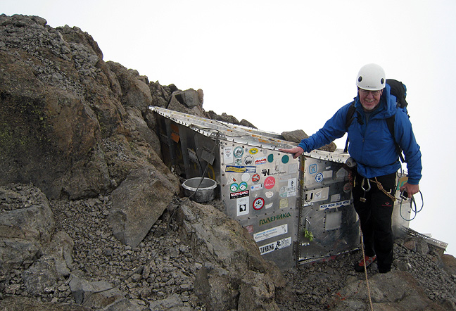 We took a moment to check out the claustrophobic but often-useful Howell Hut just a few feet from the top. It sleeps four, in theory... though it would be tight, as you can see! |