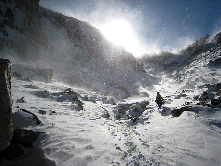 The upper part of Tricouni Nails. This is the part that almost never forms, but was thick and relatively easy this year. The wind began to make itself felt as we climbed. You can see the blowing snow against the deep blue sky. Harbinger of the approaching storm. |