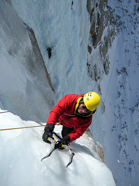 Chris near the top of Tricouni Nails. You can see other climbers on the Bard-Harrington Wall. |