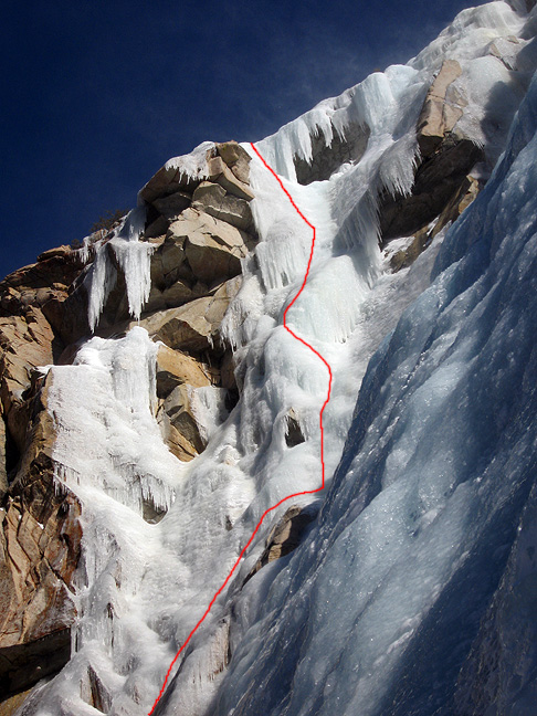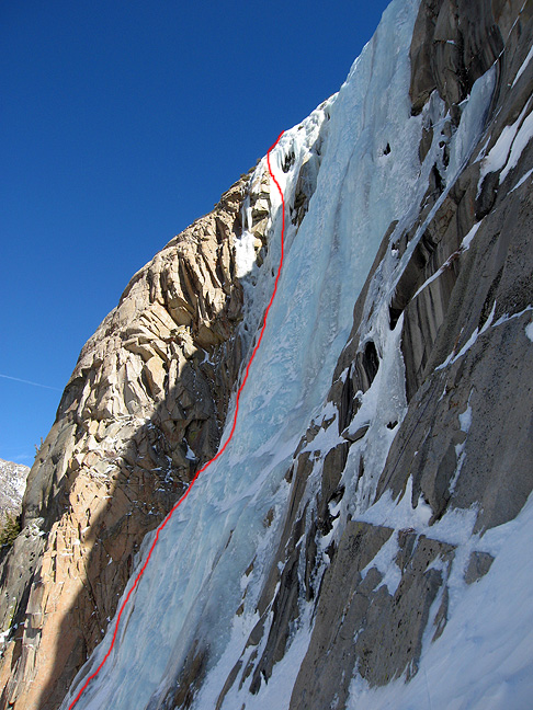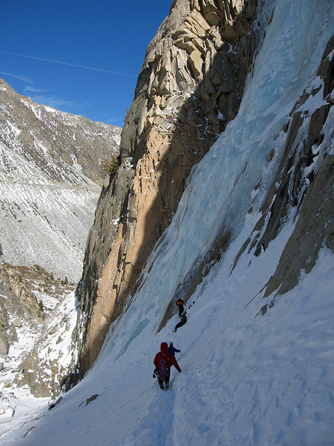 In the last few years the far left side of Lee Vining ice, the Bard-Harrington area, has come in very very thick. And this year took the record with more ice in more places than anyone who's anyone can remember. We decided to start with a route that very rarely comes in, Tricouni Nails on the far left of the falls. |