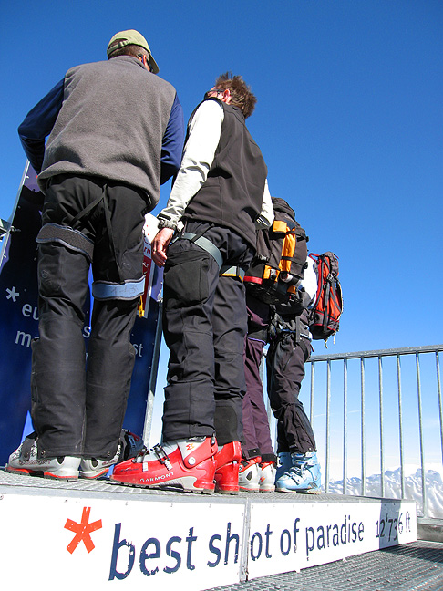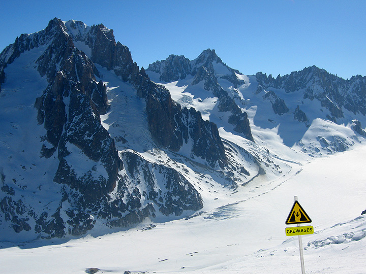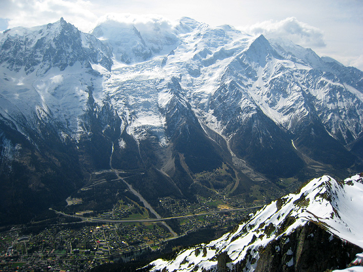 Our first day was meant to be a descent of the Vallée Blanche. Strong foehn winds pouring over the range from the south, kept the Aiguille du Midi telepherique closed for the day, so we instead rode the lifts to the top of the Brévent. The views across to Mont Blanc were fantastic, even if the snow was rather ... heavy. |