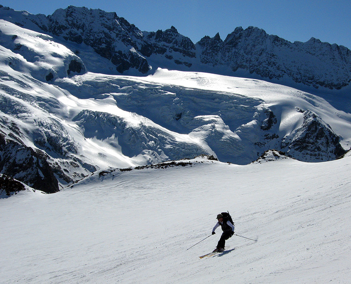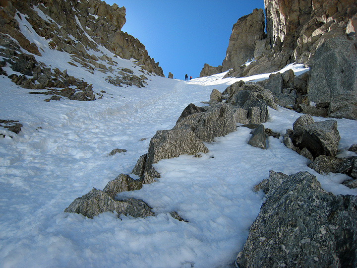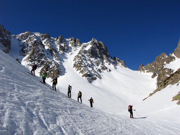 The Col du Chardonnet, seen here from below, was free of traffic—an unusual and welcome situation! A fairly straight-forward lower leads to easier ground below. |