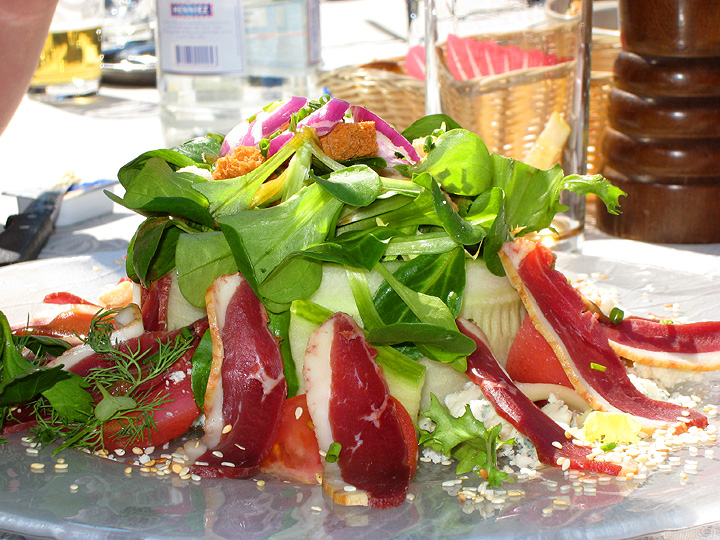 After taking a taxi from Champex to Verbier, we enjoyed a meal, and what a meal! Dr. Atkins would no doubt approve of this "Devil's Tower" of a salad. . |