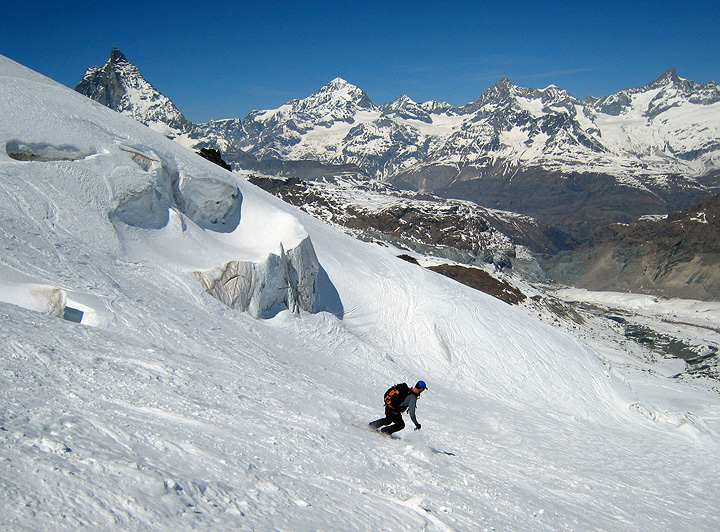 Having arrived in Zermatt without using up our "weather day", we had an extra day to spend. Despite the rising hem of the snow-line, we decided to eke out a trip down the Schwartz Tor. First, we had to pause at the viewpoint of the Klein Matterhorn, and admire from a distance the scenery we had spent the last week crossing. |