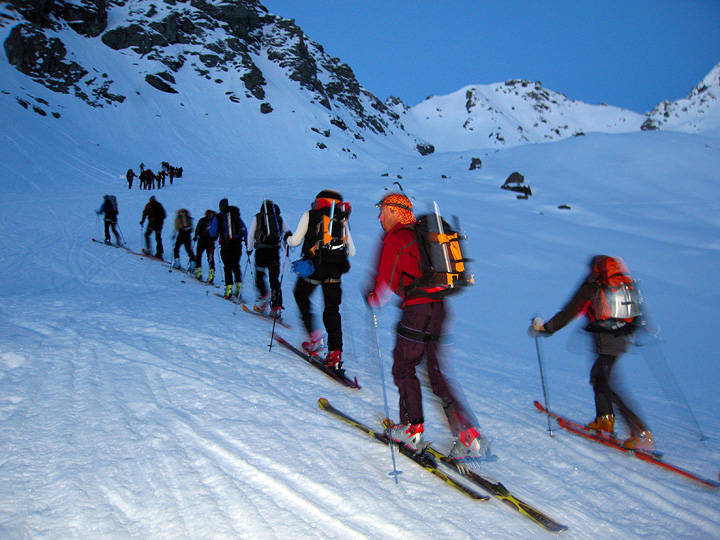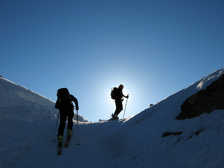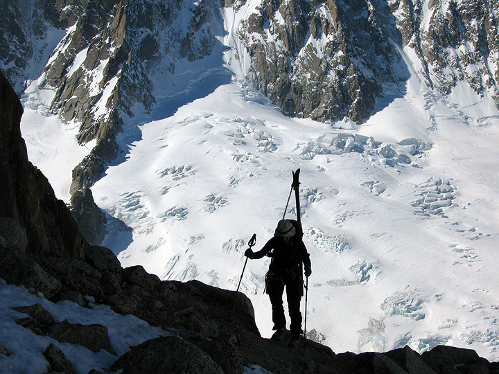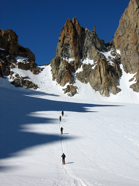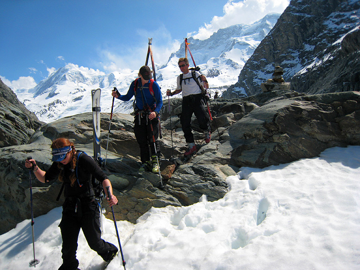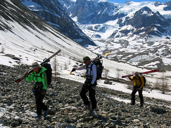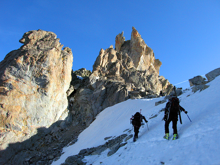 Dry conditions at the base of the glacier leading to the Col du Chardonnet, led us to opt for skis on the pack for the first few minutes. |