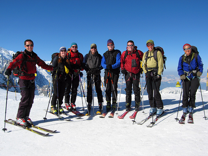 "The Crew", seen above at the start of our trip near the top of the Grands Montets, from left to right: Hamish Love from Wellington New Zealand; Cricket Fisher, currently studying in Oxford UK; Jay Coburn of Beverly, MA; Bill Graham of Tallahassee, FL; Terry Fisher (father of Cricket) from Lexington, MA; Bryan Desloge—also from Tallahassee—and Rachelle Love, married to Hamish. |