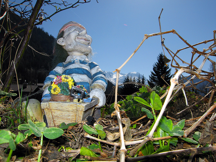 Cute? Or creepy? You decide... Mark was struck by this "non-traditional" garden gnome in Champex. |
