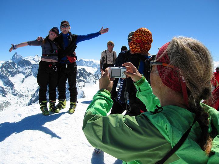 On our day 5 of the tour, we reached our high point, the summit of the Pigne d'Arolla. The Matterhorn makes an appearance under Cricket's right hand. |