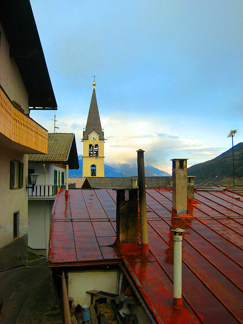 Due to the busy Easter week, we stayed in a hotel outside of Sulden, in the nearby village of Stilfs (or Stelvio, if you prefer the Italian name). This turned out to be a charming place, little changed over the years except for the meticulous upkeep of the houses with modern accoutrements. |
