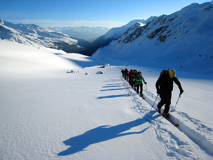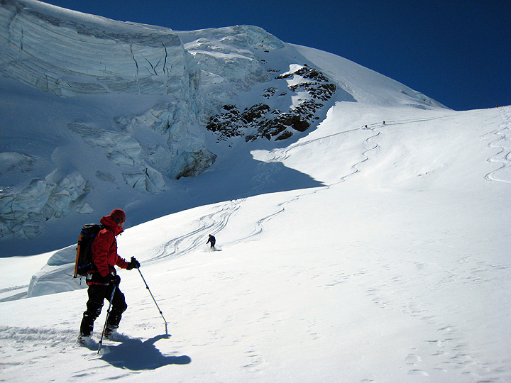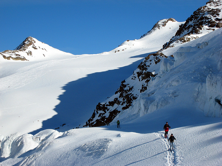 After a stern test of our kick-turn mettle on steep slopes, we emerge into welcome sunshine on a gentle glacier bench. |