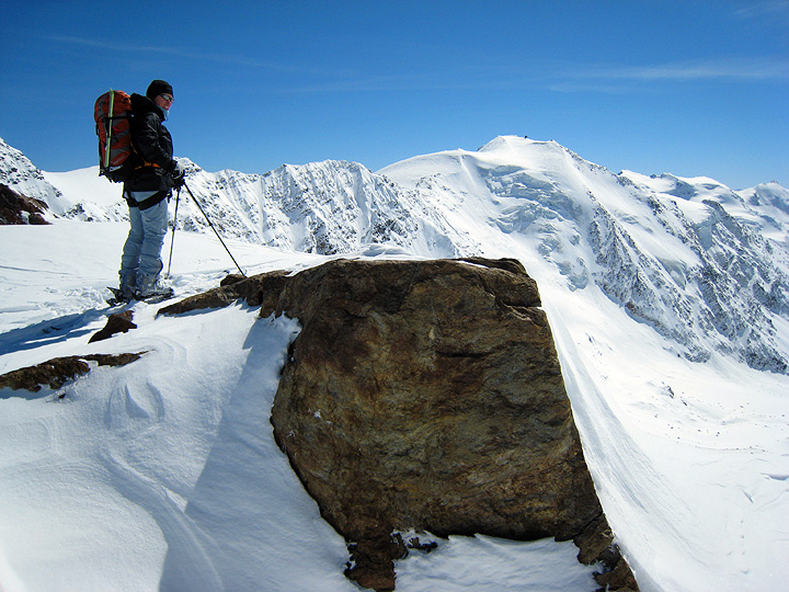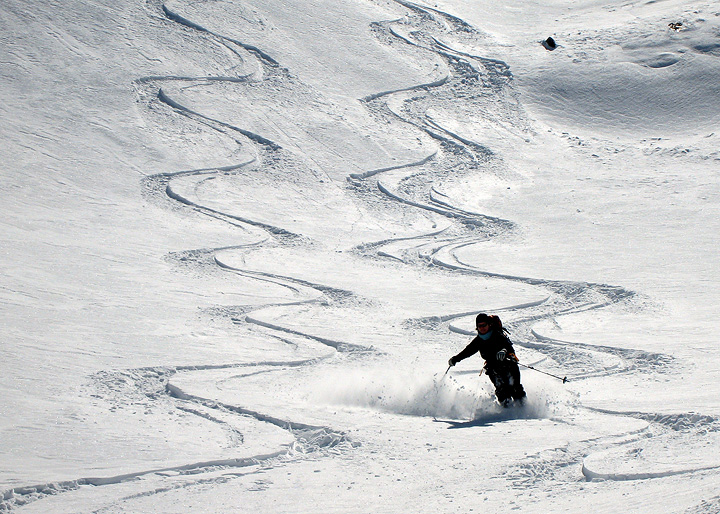 Moving over to the Pizzini hut, we took advantage of the corn conditions on this south-facing part of the valley (the powder was pretty much eaten up by now anyway!). Here we approach a high point on the ridge above the hut, taking in a long afternoon lap after lunch. |