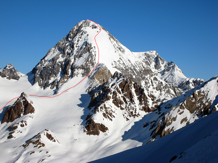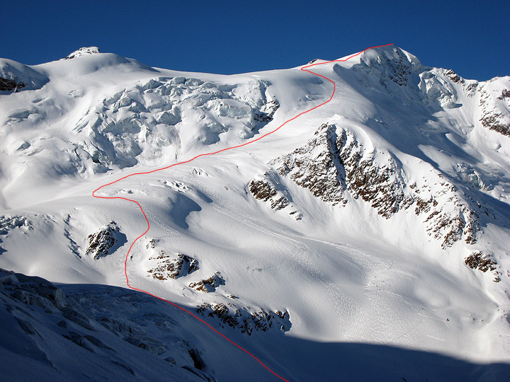Our next day we split up, the "boys" accompanying Mark for more corn snow skiing, while the "girls" went with Kathy for an Alpine ascent of the Grand Zebru. Ascent line in red here... |