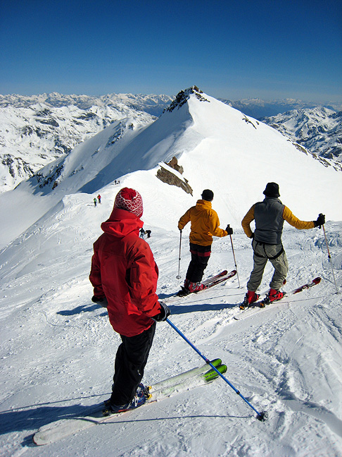The morning of our departure dawned grey and stormy, with a welcome snowfall of about 12 inches. It cleared by early afternoon, leaving one of the season's rare powder stashes to play in. The group here ascends toward Cevedale from the Marteller Hut. |