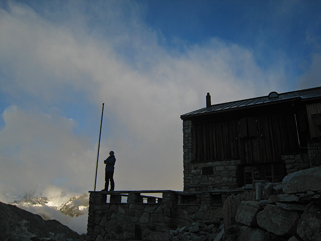 The following day we moved around to Saas Almagell, and hiked up to the Almageller hut, hoping for good enough weather to climb the South Ridge of the Weissmies the following morning. We had enough time in the afternoon to do a 4 pitch rock route on the nearby Dri Hörnli, but Kathy took no photos! Here Nick steps outside the hut to enjoy a break in the weather. |