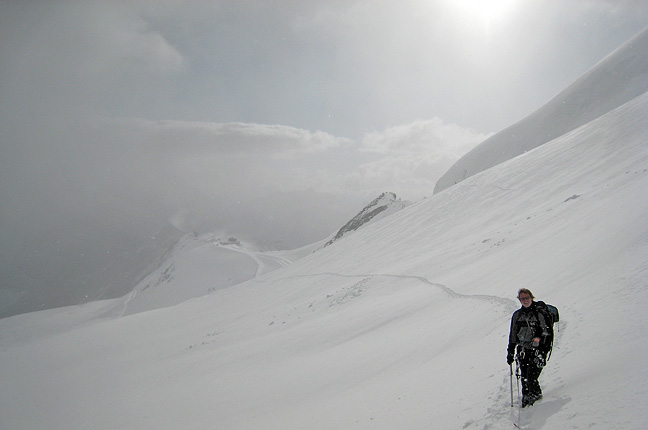 The morning dawned foggy and drizzly, the snow soggy and unfrozen. Still, in the spirit of "putting ourselves in a position to get lucky", we headed up to the col to see if there would be any change in the first hour or two of the day. The only change was the marked increase in the wind as we gained elevation! Here Nick braves powerful gusts at the ridge crest, bracing his feet on the icy rocks. |