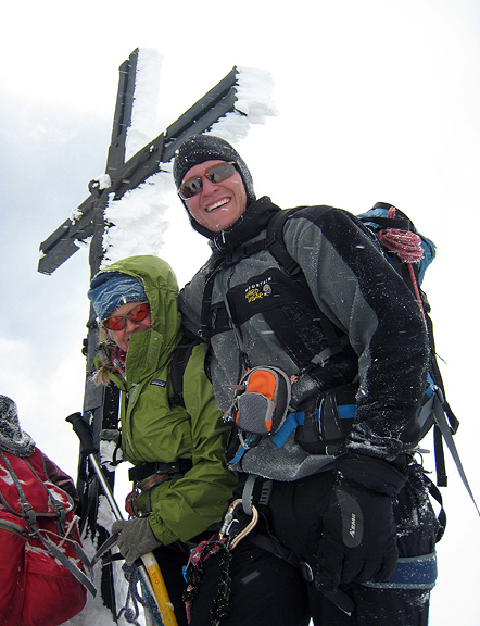 The crowds did catch us near the summit, as we groped around in the fog. We all arrived together, and took turns doing the photography honors. Kathy and Nick pose for the shot... |