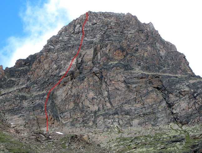 After descending to Saas Almagell for a well-earned shower and bed, the following morning we headed up to the Hohsaas hut. Arriving by 9:30, we had plenty of time to hike down to the Jegihorn, and climb a 13-pitch rock route, "Alpendurst". The route more or less follows the red line here. This was Nick's first multi-pitch route! (or rather, his second. His first was two days back on the Dri Hörnli). Quite a long route for an introduction! |