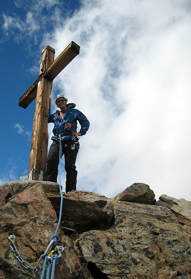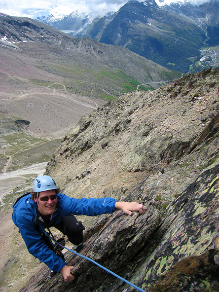 Nick likes the space below his feet. Great views to the Mattmark reservoir in the distance on the left, and of Saas Fee just in view on the right. |