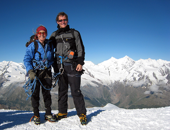 | Nick Grossoehme took some time between finishing his PhD and starting a new position in Indiana, to do some climbing in the Alps with Kathy. An experienced hiker and explorer, the high mountains were new to him, so we planned a glacier odyssey over the Monte Rosa Traverse. Alas, the weather didn't allow that itinerary, so we opted to take in some less-committing peaks in the Saas Fee area, ones from which we could retreat if necessary, and adjust our plans as the forecast and conditions changed. |
