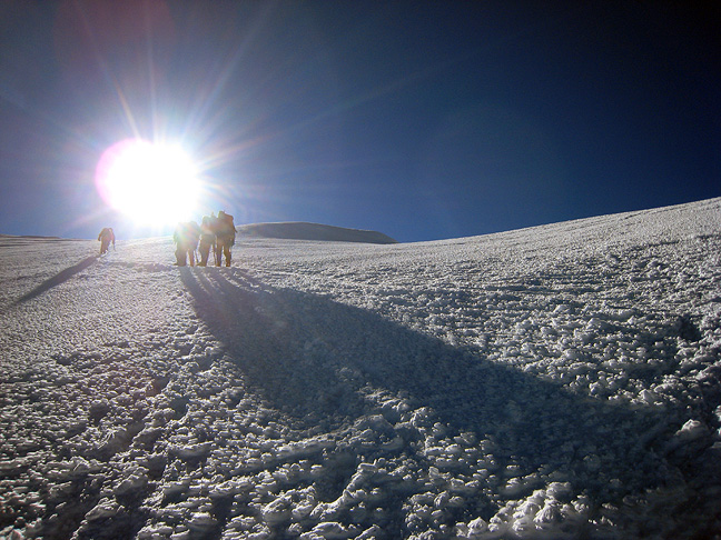 In fact all the storms have left the high glaciers in excellent conditions for the time of year. We look back up the steep summit slopes as other parties climb by on their way to the top. |