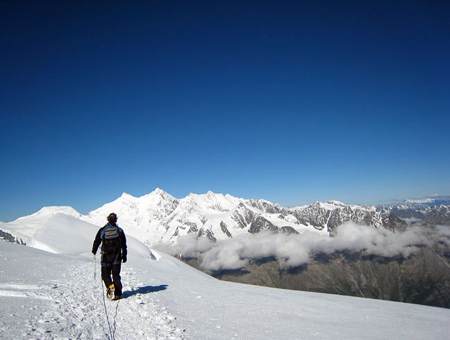 The morning of our last day, the weather finally is what we had hoped for all week: clear and cloudless, a cold but light wind, good freezing conditions on the glacier. Here we see the Mischabel ridge across the way as we start out up the Weissmies. From left to right: Allalinhorn, Feechopf, Alphubel, Täsch and Dom, Lenzspitze and Nadelhorn. |