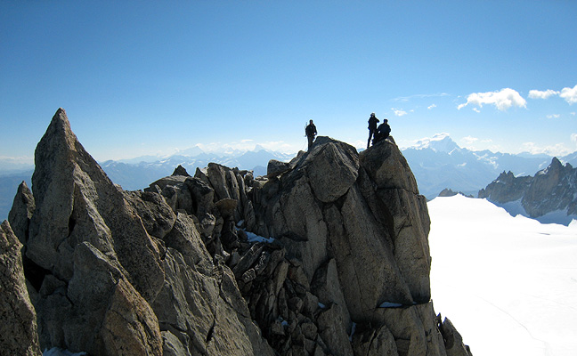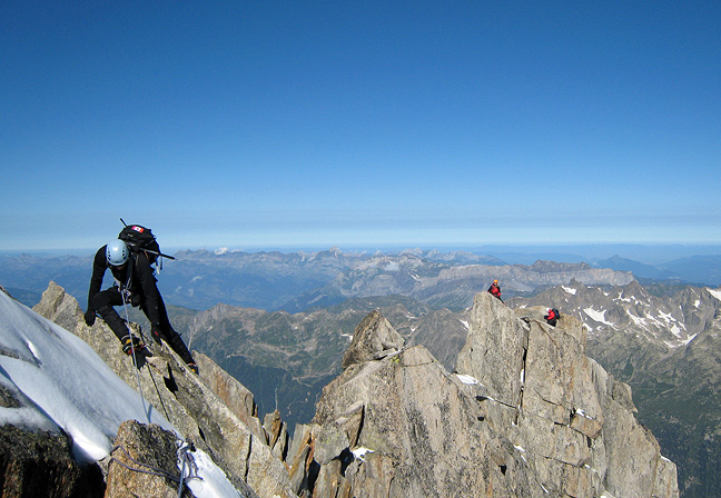 We got to the "summit" early (this climb ends rather arbitrarily at the first major tower along a ridge that ultimately leads to the summit of the Aiguille Verte, a long, long way away), so we continued along to the next bump, just to see what we could see. David negotiates a complicated threading of towers here, while other climbers on the "normal" summit think it over... nahhh. |