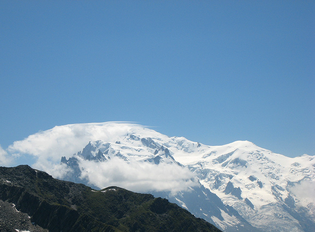 The weather continuing clear, we decided to have a go at Mont Blanc, via the Traverse. Here some scary-looking crowds contradict the rather favorable weather forecast. It must have been the tail end or edge of a weather system, as this did not in fact presage any cloudiness. |