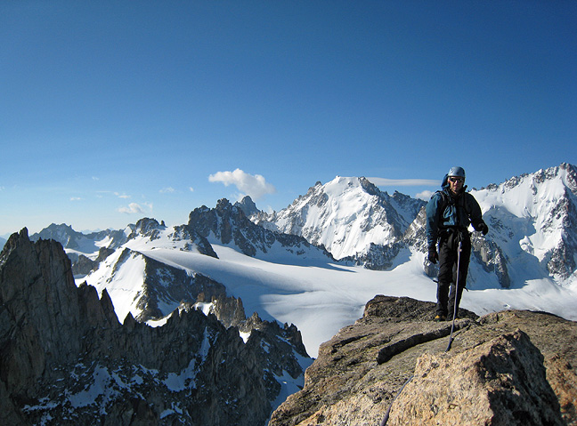 We covered a lot of ground, from the Aiguilles Rouges to the summit of Mont Blanc. Here we find a friendly climber to take our photo on the summit of the Aiguille du Tour with Mont Blanc and the Chamonix Aiguilles in the background. |