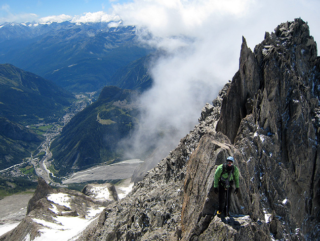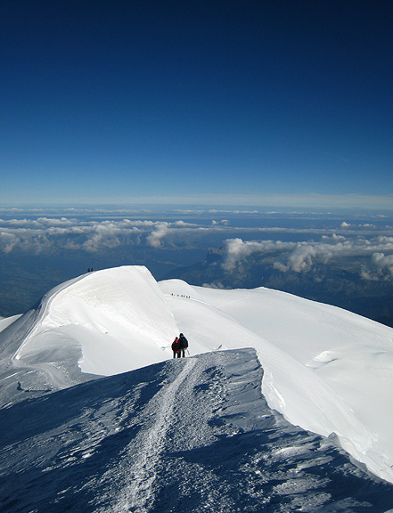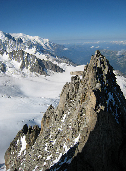 Approaching the end of the climb, the crowds eased off. Looking down the NW flank of the Aiguille to the glaciers seeming miles below. |