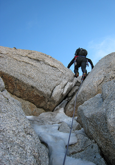 One of David's goals was to begin working on more autonomy in terms of leading and putting together a climb on his own. We took advantage of an ascent of the Cosmiques Arête on the Aiguille du Midi, to get him on the "sharp end". Here he wends his way up a mixed section near the beginning of the climb. |