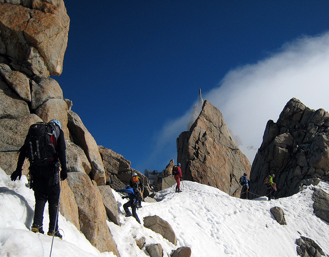 This photo shows off the typical features of this climb; the busy-ness, the snow, the rock, and foreshortening to the end of the route; you can see both the "sputnik-era" needle placed for visual effect on the summit of the Aiguille du Midi, and the observation deck area onto which the climb dumps you at the end of the road. |
