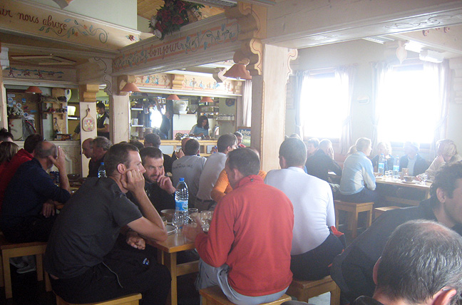 A typical dinner hour scene at the Cosmiques hut in good weather; warm, steamy, congenial, busy (the appetizing smell of dinner about to be served doesn't come through in the photo however). |