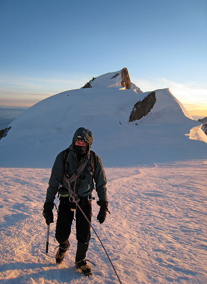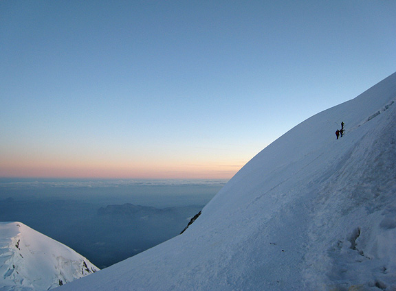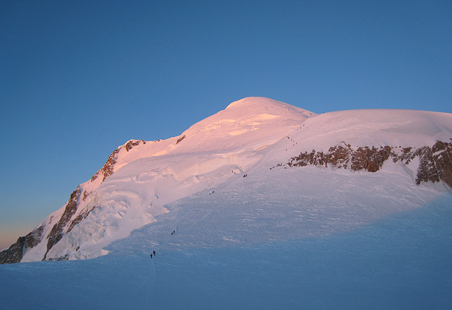 Looking up the final slopes to the summit of Mont Blanc, the sun began to tint the snow a tantalizing rosy color. |