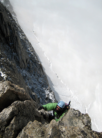 Still pretty cold, David pulls up carefully on the north side, looking for hand and foot-holds free of ice. |