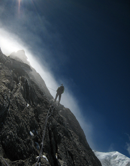 The next morning was not only cold, but windy! Traversing the back (west) side of the shoulder of Mont Maudit, we encountered the wind in the raw. |