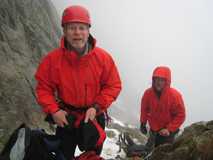 Finding a good objective for our first day was a bit of a head-scratcher. With rain and snow in the forecast, and possible afternoon thunderstorms, our choice had to be feasible in nasty weather and not take too terribly long. The Traverse of the Crochues fit the bill, and we were off. On the climb the rain and snow came and went, but never truly got unpleasant. The worst of it was the lack of views, which normally are quite impressive from this peak. Here, Norm, on the left, and Curt, on the right, stop for a moment mid-route. Kathy, climbing with Ken Seamon, also did the Traverse this day, adding pleasant company and a bit more security. |