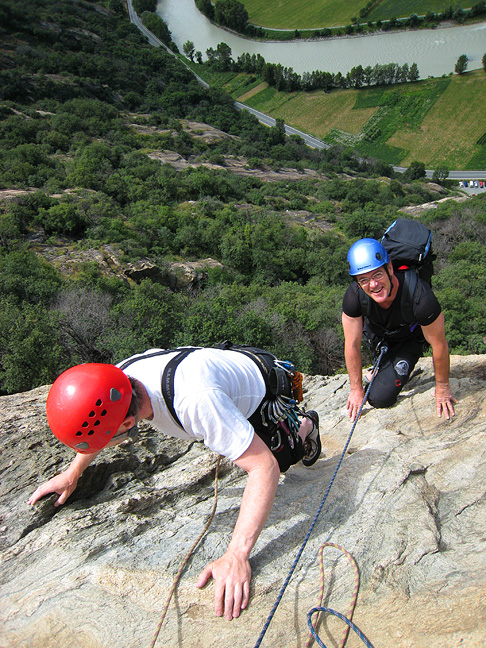 Fortunately for us, the stream of bad weather shifted to a more westerly origin overnight. This meant that while the main mountain massif was still hidden under cloud and darkness, the sun was likely to emerge in Italy's Aosta Valley, just a quick drive though the Mont Blanc tunnel. We enjoyed a great day of sunny rock climbing at Machaby. Here are Norm and Curt on Bucce d'Aranccia, a 9-pitch classic on the main cliff face. |