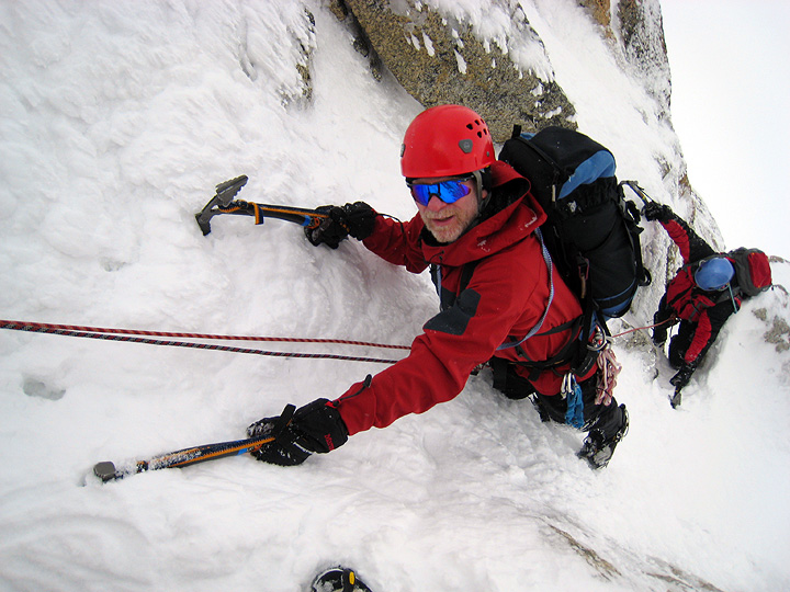 With merely blustery weather forecast for our third day, we chose the Chèré Couloir as our objective. This fun 4-pitch ice route on the North Face Triangle of Mont Blanc du Tacul is a good choice when the weather is cold and cloudy, as fewer climbers are inclined to brave the chill. This means that the risk of icefall in this narrow couloir is significantly reduced, a good thing. Here, Norm and Curt emerge from a tight chimney on the third pitch. |