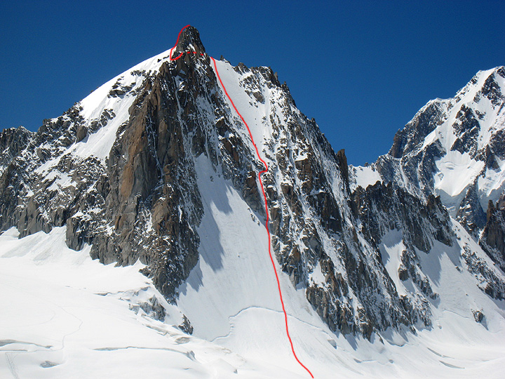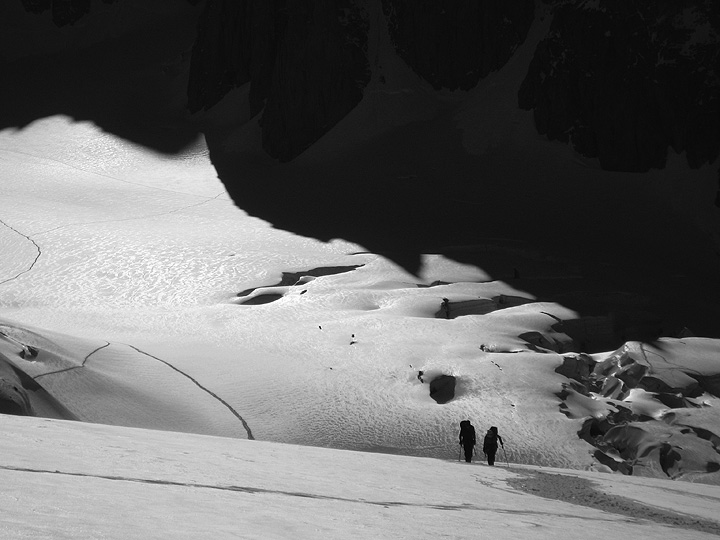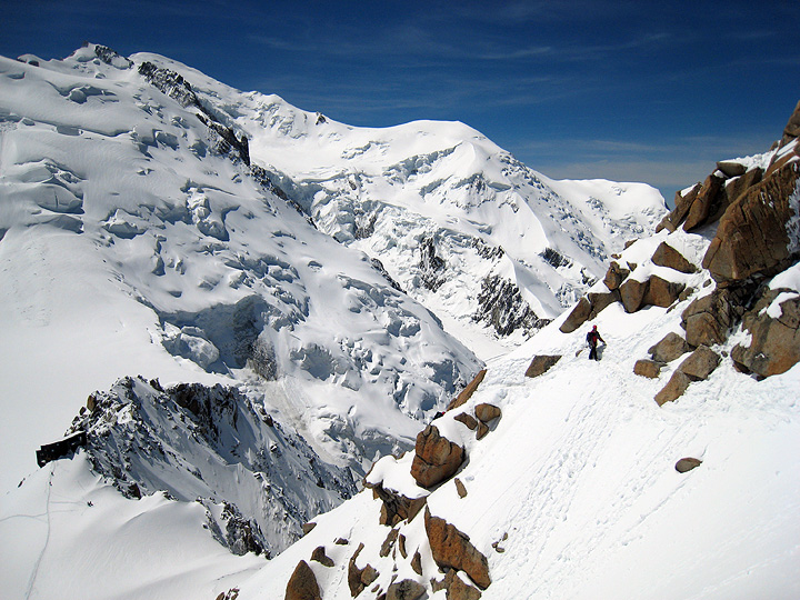 Looking back up our route of descent, the Bosses Ridge on Mont Blanc. |