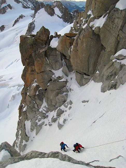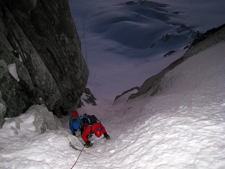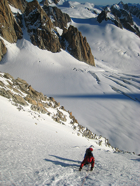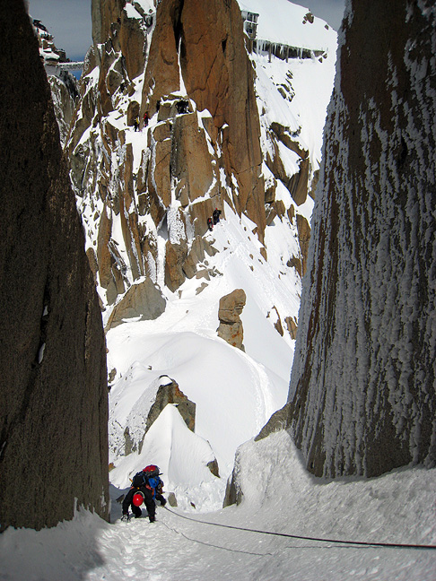 Descending a narrow ice couloir before the final pitches of the route. Unfortunately, these last pitches were rather choked with other climbers who had the same Cosmiques plan as us, and we had to wait in line for our opportunity to finish the route. |