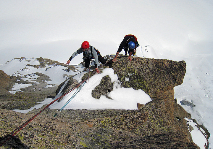 Finally, the weather cleared beautifully. With over a meter of new snow at 4000 meter elevation we decided to give it a chance to settle before tackling anything too ambitious. A fun ascent of the Arête des Cosmiques was the climb du jour. Here we descend the snow arête leading down from the Aiguille du Midi. |