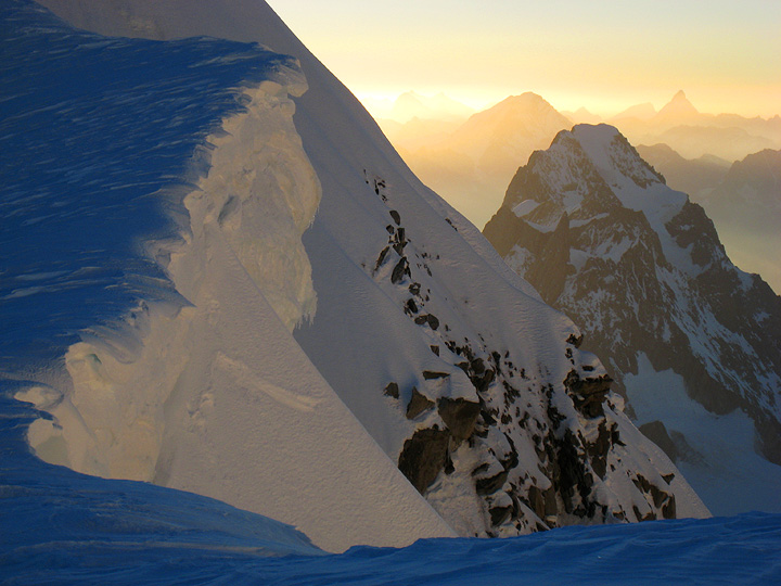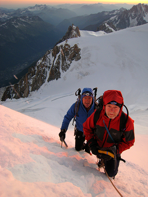 Not to let a little exhaustion deter us, we decided to end the week with an ascent of the Traverse of the Three Summits of Mont Blanc. In this photo dawn arrives as we climb the steep snow slopes of Mont Maudit. |