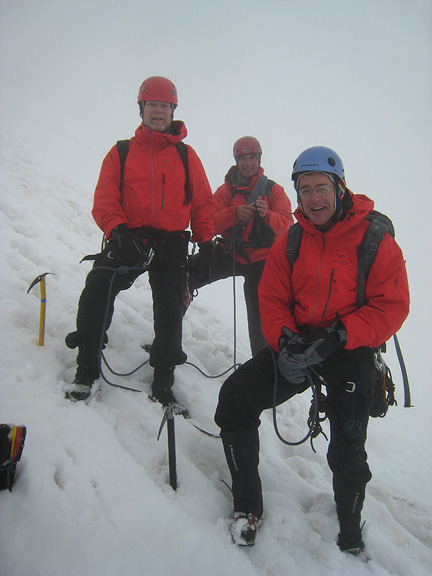 The difficulties over, we pause to un-rope and descend together with Mark, Norm and Kurt. |