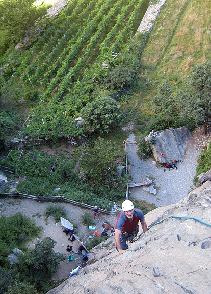 The following day turned out to be significantly dryer south of the Mont Blanc massif, so we piled into the car and drove through the tunnel to the Aosta valley. Ken here on pitch 1 of Toppo Pazzo, a lovely 3 pitch climb above the vineyards in the Machaby area. No sodden gloves on this one! |