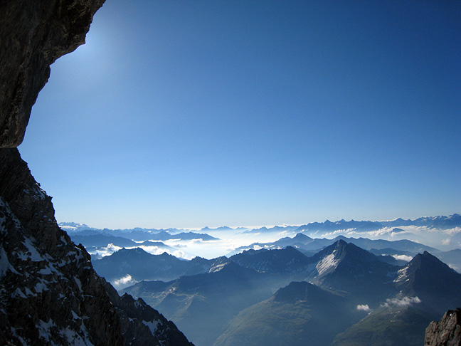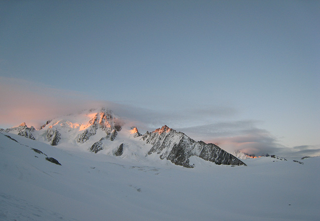 Another drizzly, misty day was spent getting to the Albert Premier hut, after which we finally got the clear, cold dawn we had been waiting for. Here, residual lenticulars add mystery to the summit of the Aiguille de Chardonnet at sunrise. |