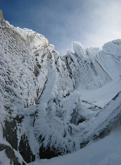 Residual mists veiled the nearby peaks along the ridge, which along with the rime ice on the rocks, lent a wintry atmosphere. |