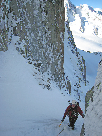 The adjacent "Table Couloir" had it's own problems, namely a large deposition of snow that had not had time to stabilize. So we defaulted to a shorter, narrower but still steep couloir nearby, that gave access to the Normal Route on the opposite side of the mountain. |